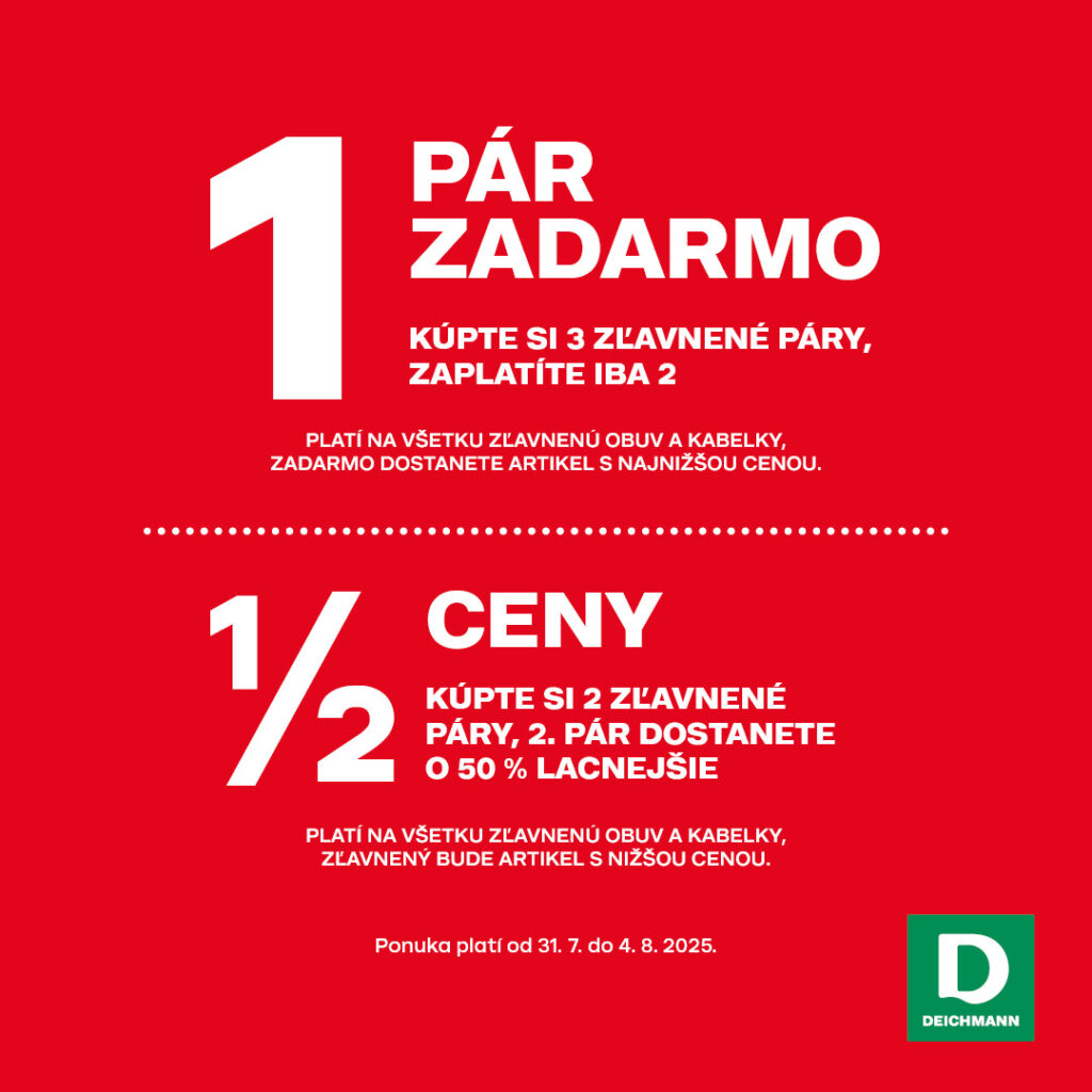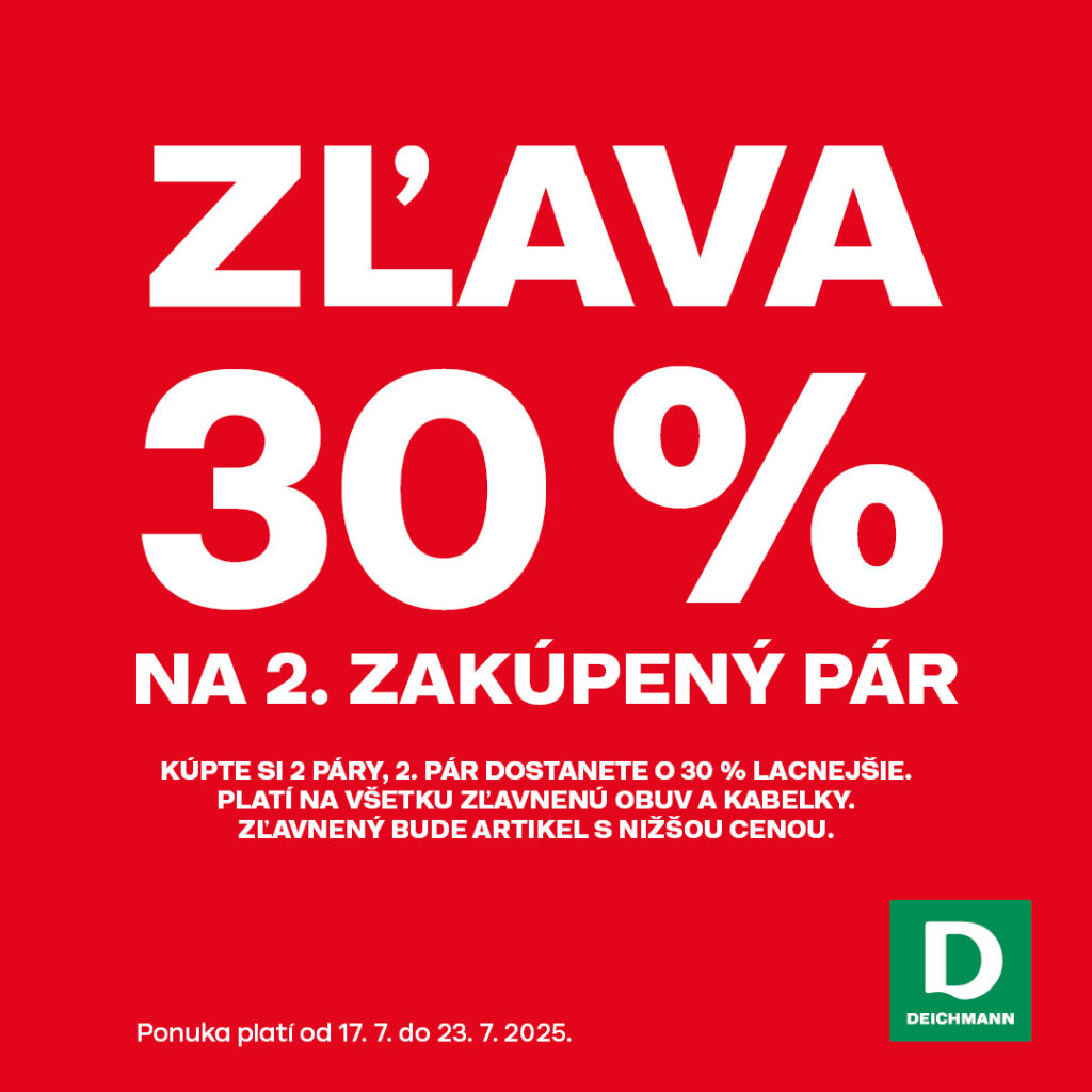 👟 Extra zľava 30 % na druhý pár obuvi v Deichmanne! 👟Letná akcia, ktorú si nemôžte nechať ujsť! ☀️Vyberte si v Deichmanne dva páry zľavnených topánok, a na druhý pár dostanete zľavu 30 %! Na šport, do mesta či na dovolenku – obuv na každú príležitosť a pre každý štýl.